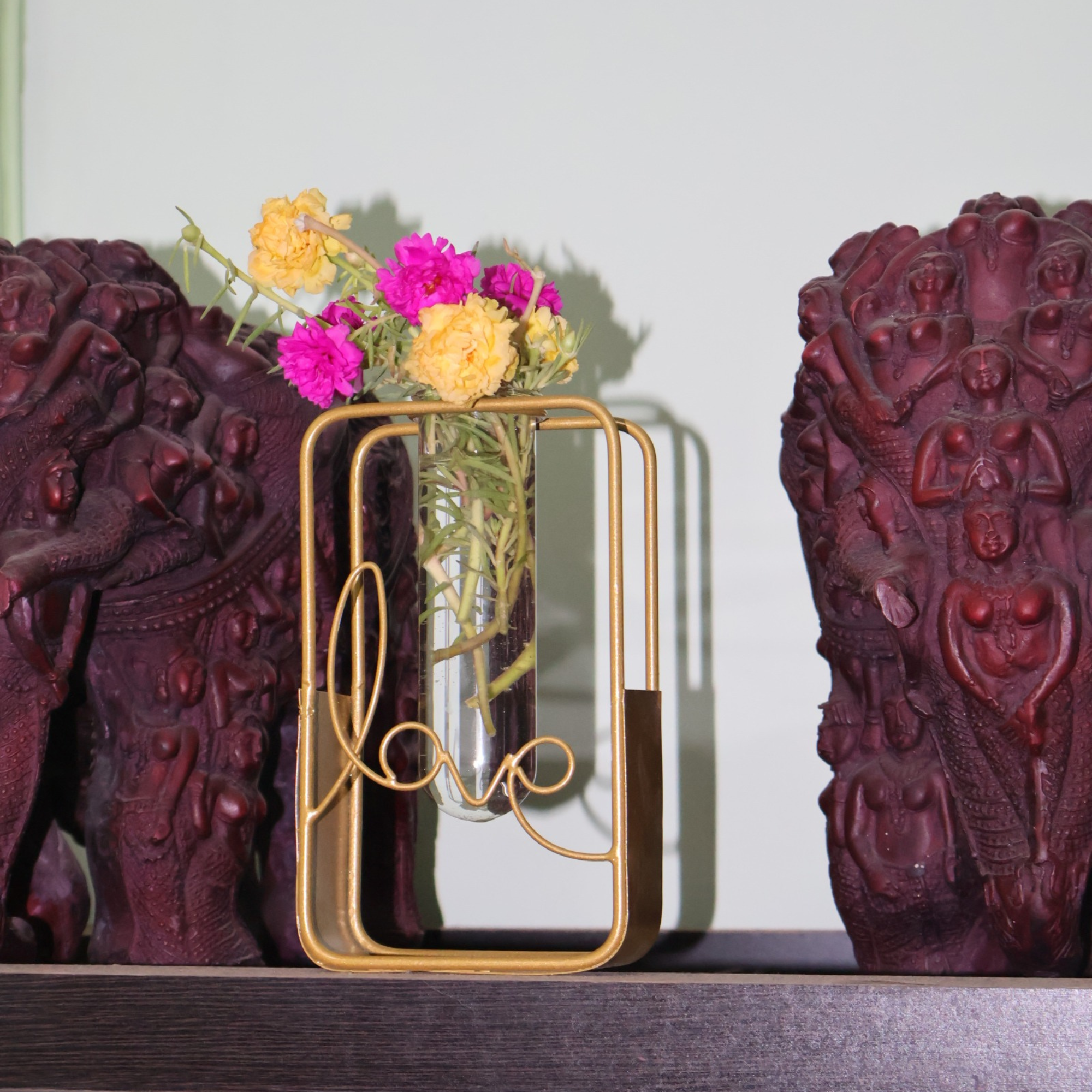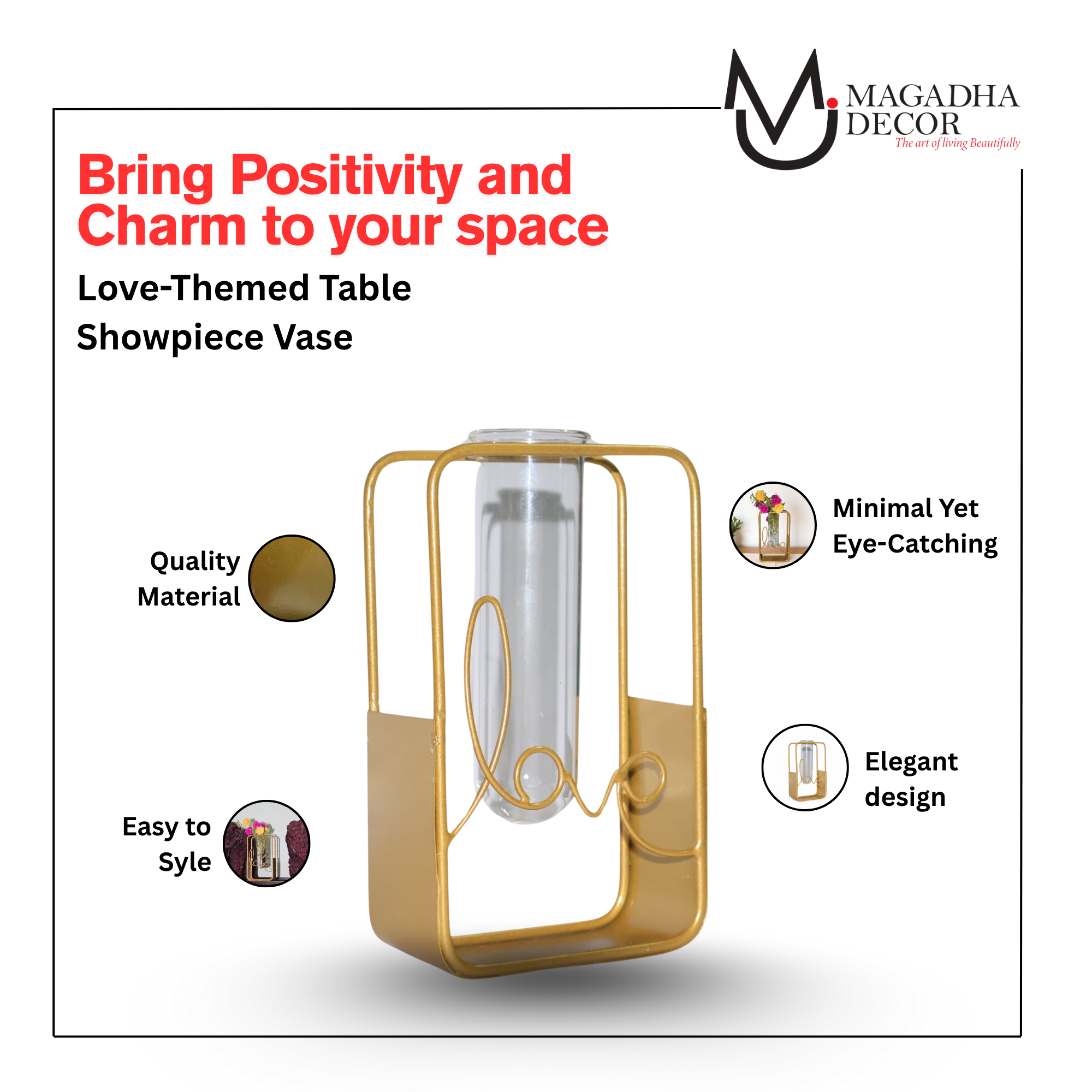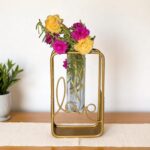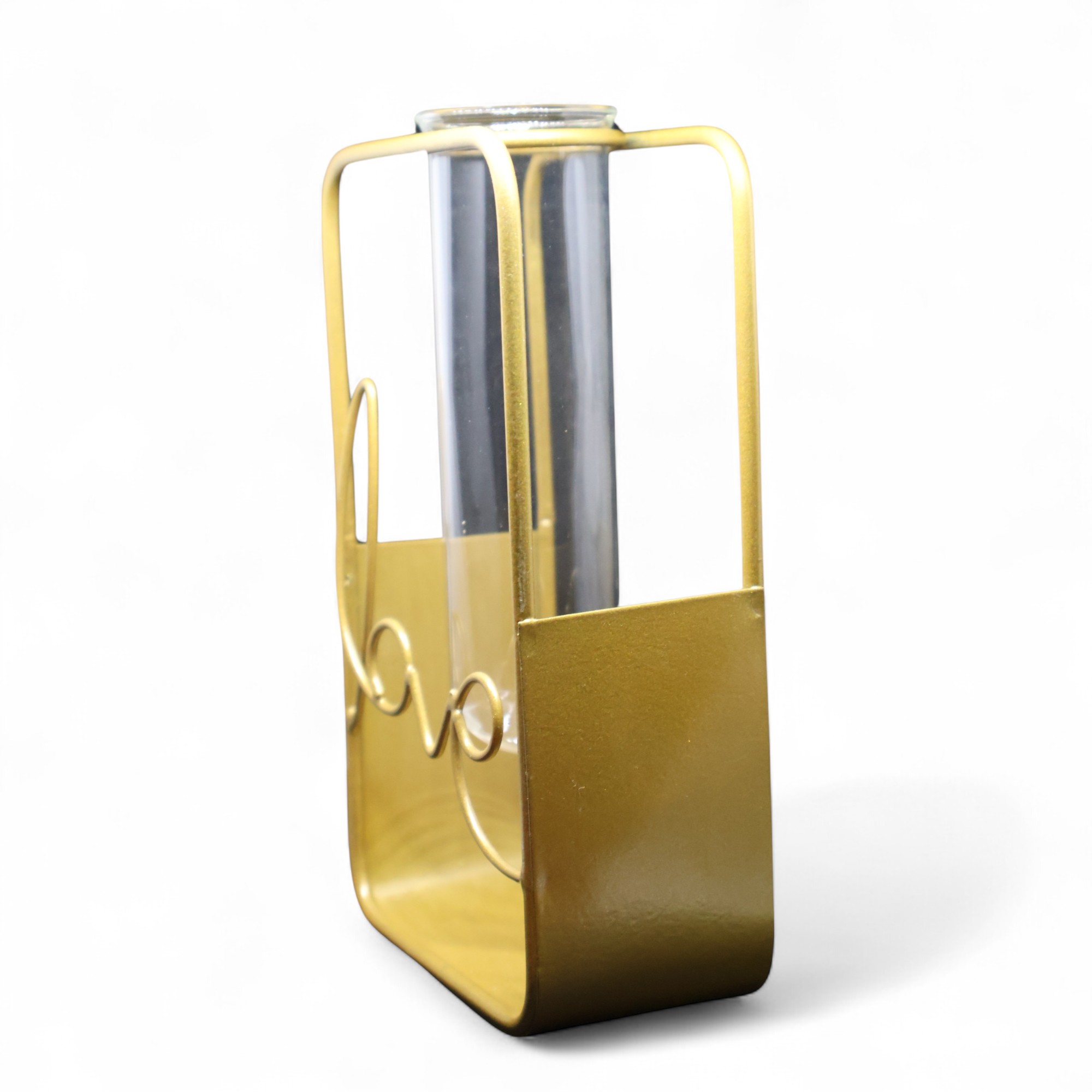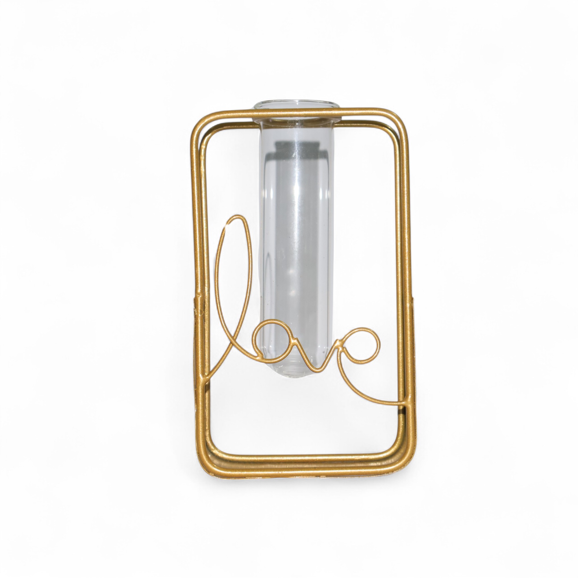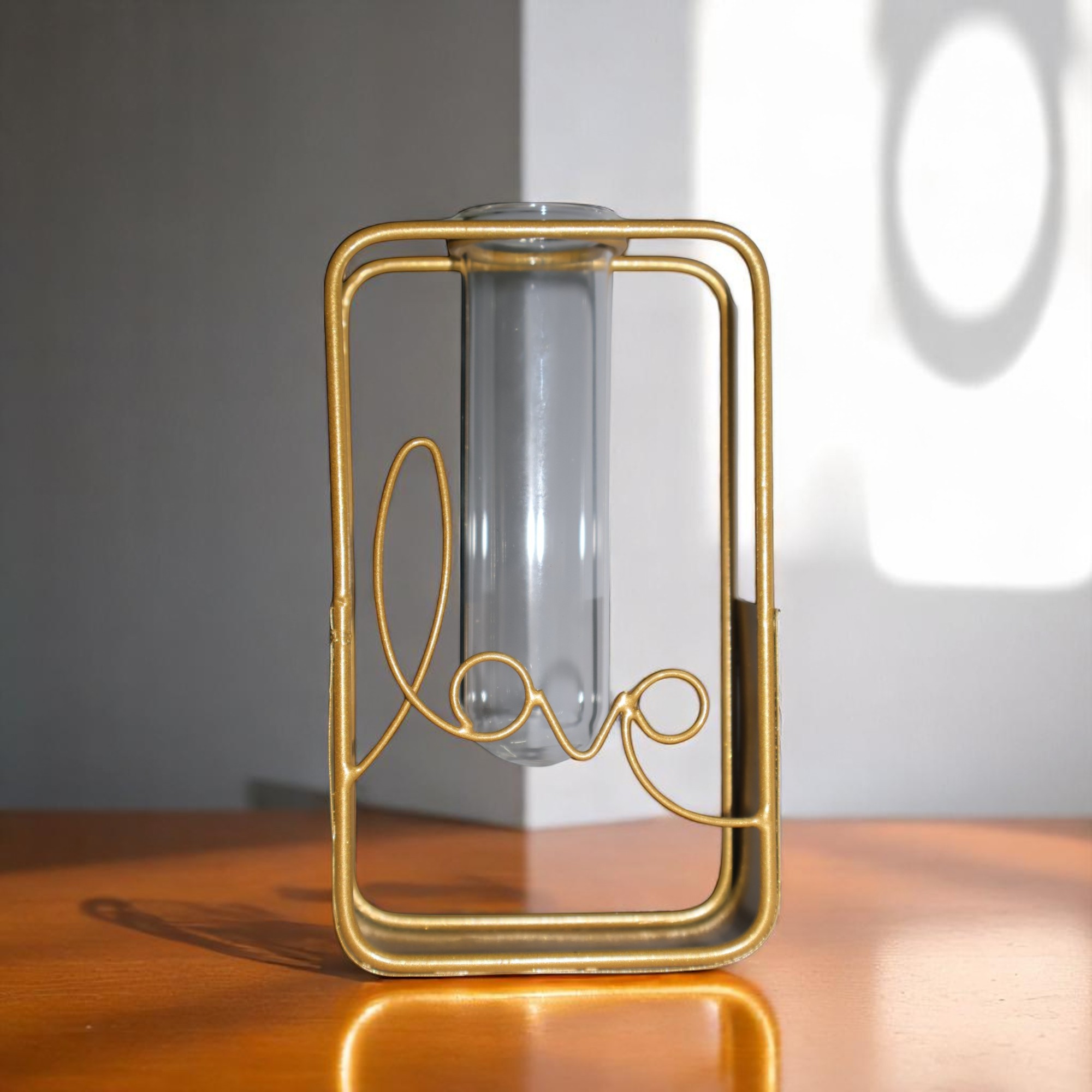Add a touch of love and elegance to your home with the beautifully crafted Love-Themed Table Vase from Magadha Decor. Designed with a sleek rectangular metal frame and a clear glass test tube insert, this minimalist flower holder speaks volumes with its simple yet striking look.